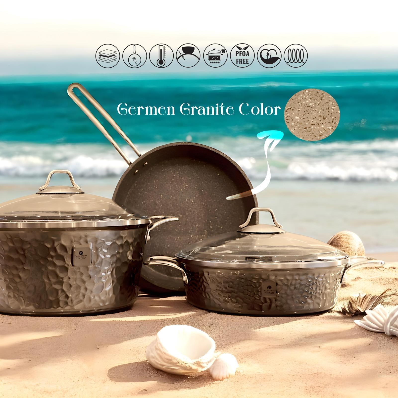 Made of cast aluminum and finished with a durable German granite coating, this cookware set ensures excellent heat conduction and a long lifespan.